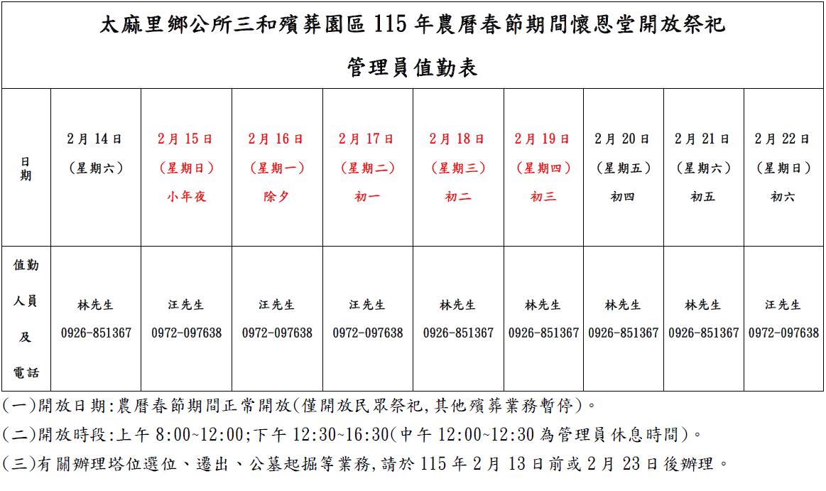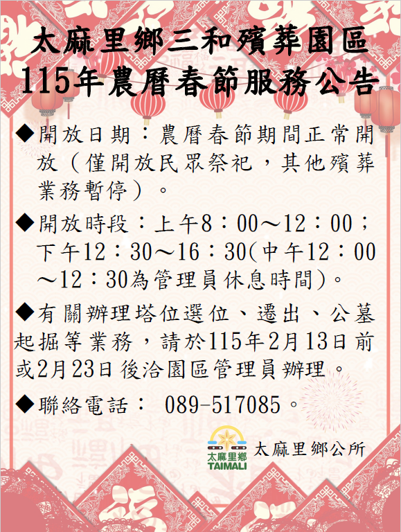 太麻里鄉公所三和殯葬園區115年農曆春節期間懷恩堂開放祭祀時間