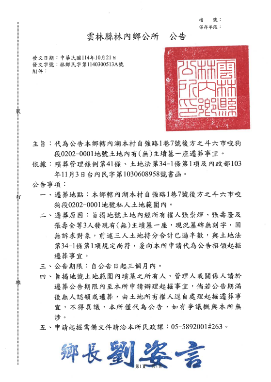 【協助公告】雲林縣林內鄉公所湖本村自強路1巷7號後方之斗六市咬狗段0202-0001地號土地內有(無)主墳墓一座遷葬公告