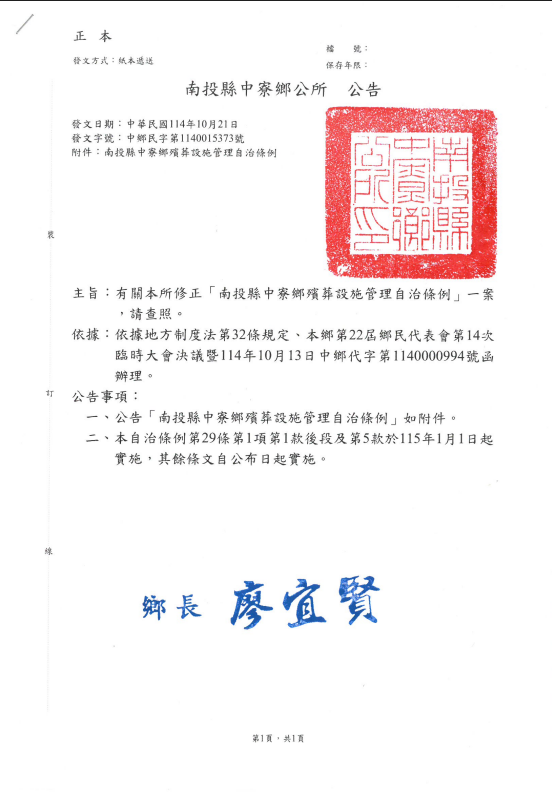 【協助公告】南投縣中寮鄉公所修正「南投縣中寮鄉殯葬設施管理自治條例」公告