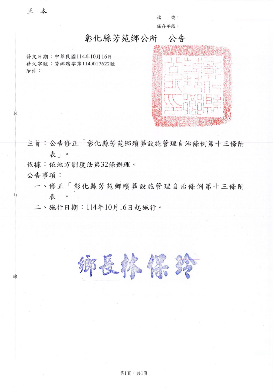 【協助公告】彰化縣芳苑鄉公所修正「彰化縣芳苑鄉殯葬設施管理自治條例第十三條附表」公告