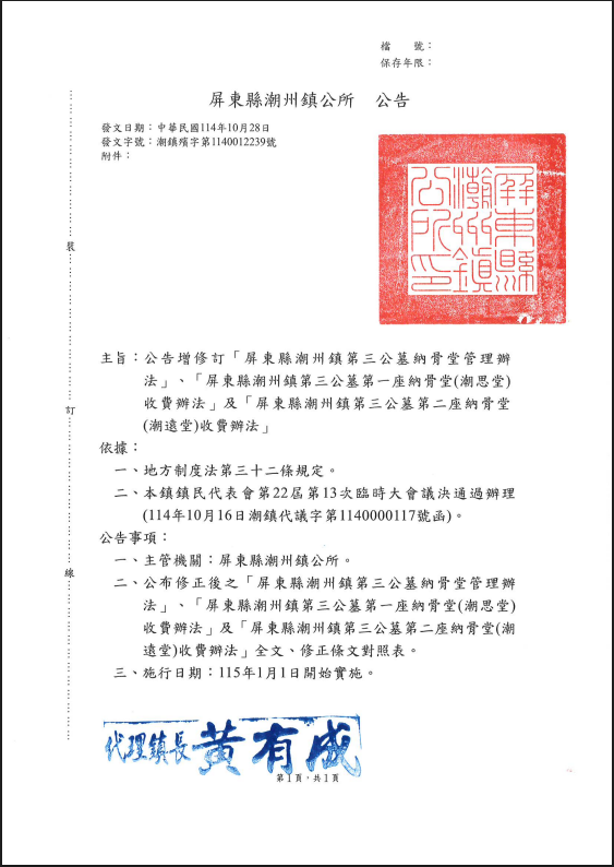 【協助公告】屏東縣潮州鎮公所第三公墓納骨堂管理辦法公告