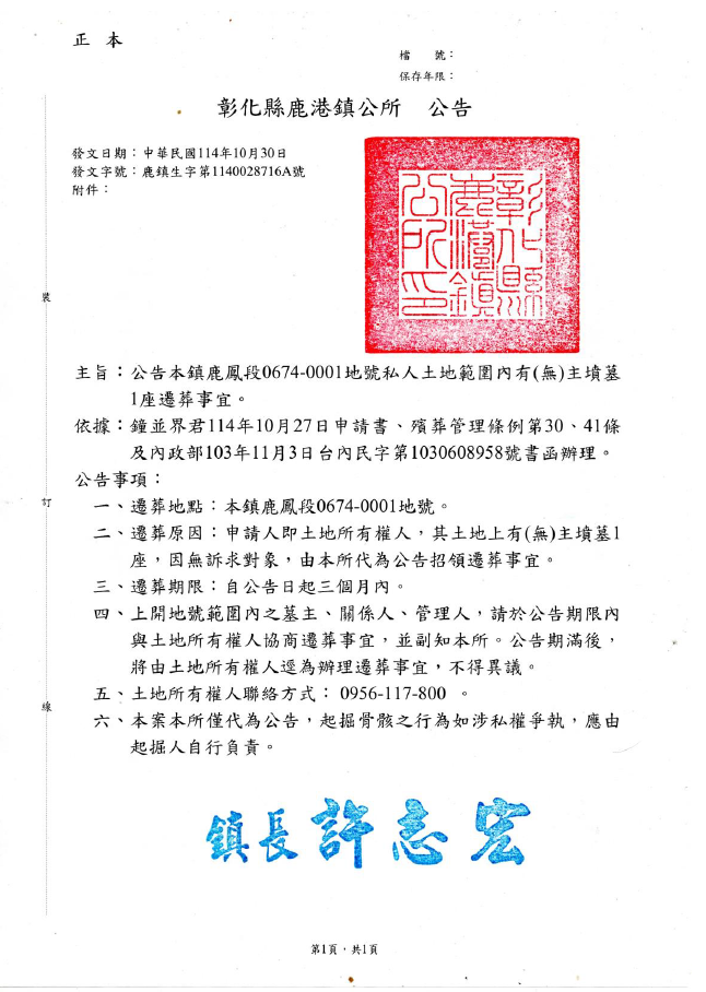 【協助公告】彰化縣鹿港鎮公所鹿鳳段0674-0001地號私人土地範圍內有(無)主墳墓遷葬公告