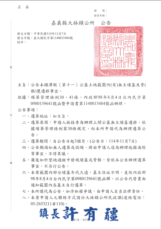 【協助公告】嘉義縣大林鎮公所潭墘(第十一)公墓內(有)無主墳墓及骨(骸)甕遷移公告文