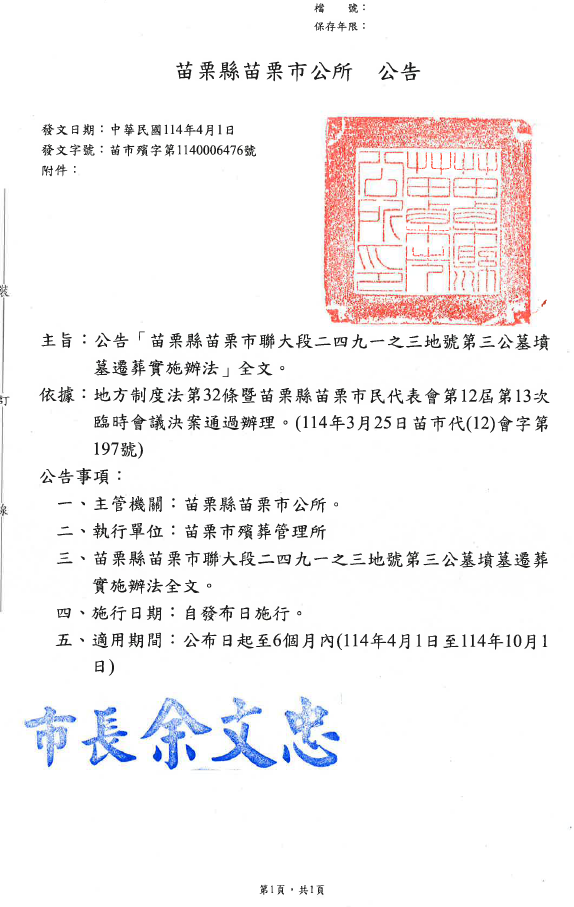 【協助公告】「苗栗縣苗栗市聯大段2491-3地號第三公墓墳墓遷葬實施辦法」訂定公告