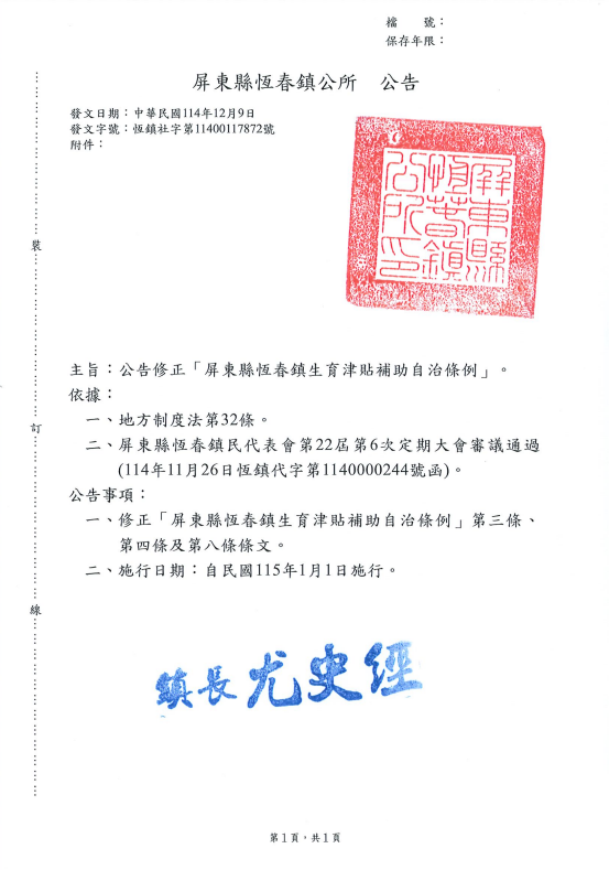 【協助公告】屏東縣恆春鎮公所「屏東縣恆春鎮生育津貼補助自治條例」公告