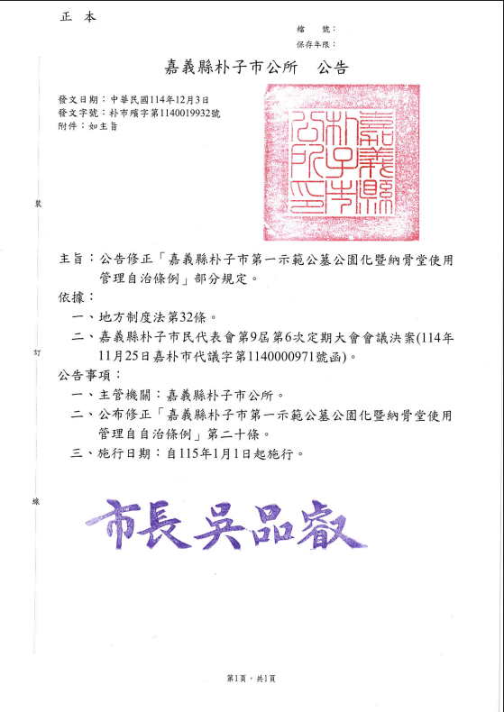 【協助公告】嘉義縣朴子市公所「嘉義縣朴子市第一示範公墓公園化暨納骨堂使用管理自治條例」第二十條修正公告