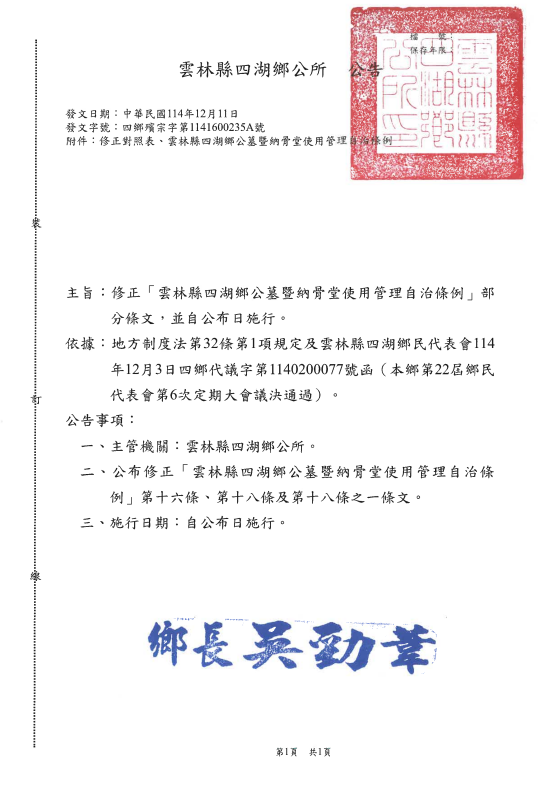 【協助公告】雲林縣四湖鄉公所「雲林縣四湖鄉公墓暨納骨堂使用管理自治條例」部分條文修正公告