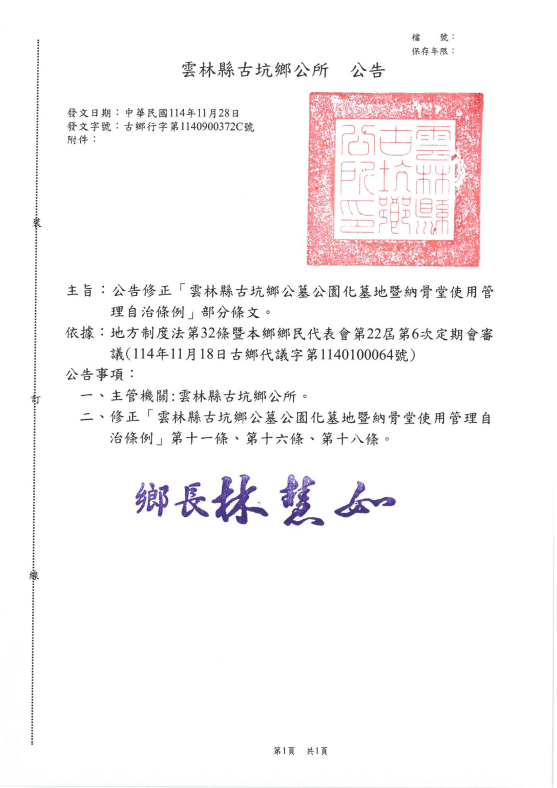 【協助公告】雲林縣古坑鄉公所修正「雲林縣古坑鄉公墓公園化墓地暨納骨堂使用管理自治條例」公告