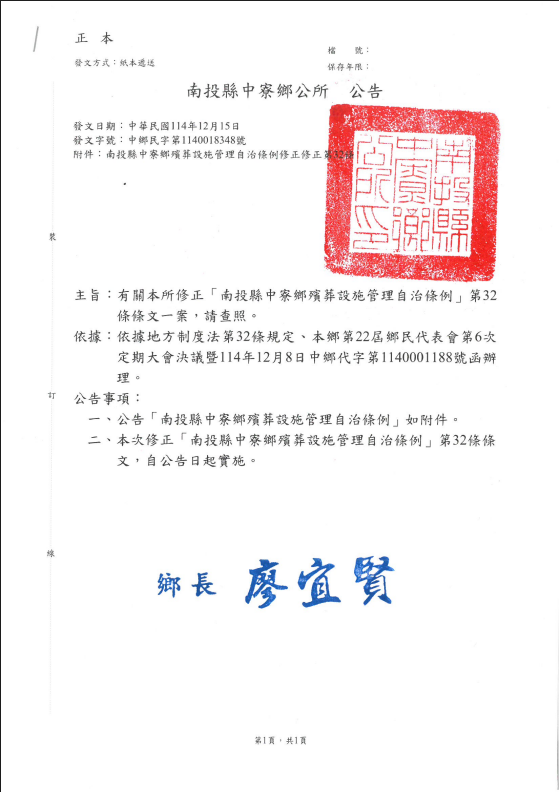 【協助公告】南投縣中寮鄉公所修正「南投縣中寮鄉殯葬設施管理自治條例」第32條公告