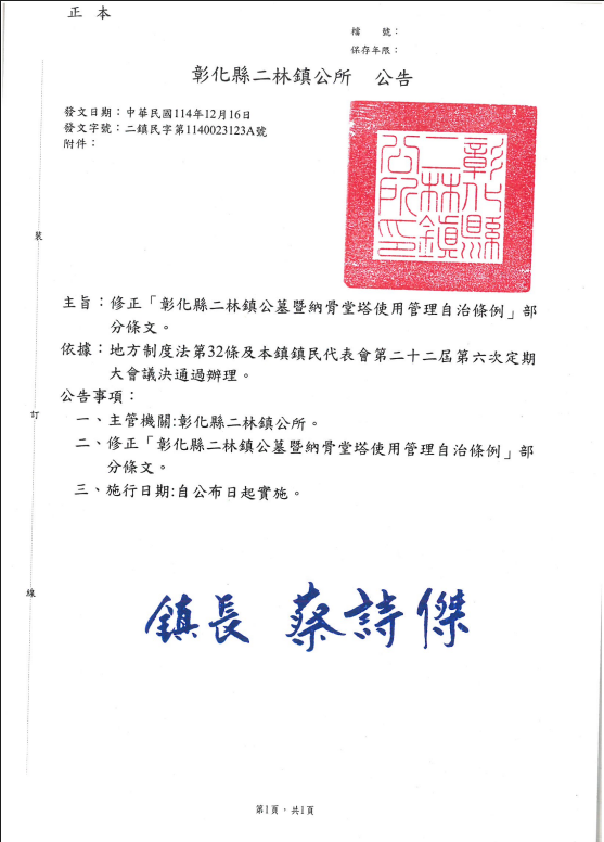 【協助公告】彰化縣二林鎮公所修正「彰化縣二林鎮公墓暨納骨堂塔使用管理自治條例」部份條文公告