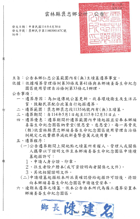 【協助公告】雲林縣褒忠鄉仁忠公墓遷葬進堂優惠辦法及遷葬公告