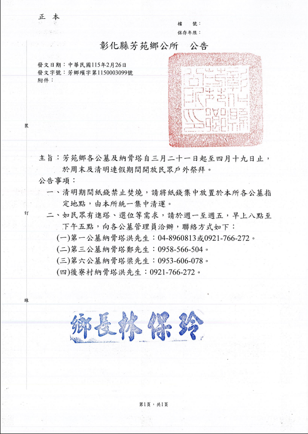 【協助公告】彰化縣芳苑鄉公所自115年3月21日起至115年4月19日止周末及清明連假期間開放民眾戶外祭拜公告
