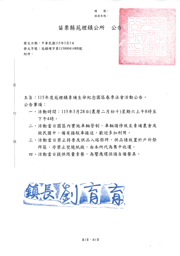 【協助公告】苗栗縣苑裡鎮公所115年度苑裡鎮青埔生命紀念園區春季法會活動須知