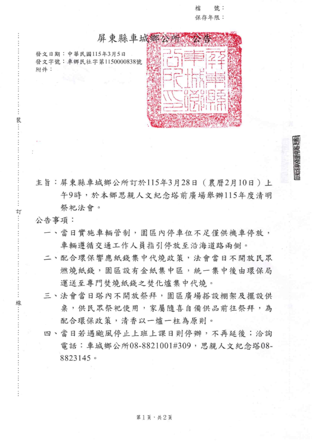 【協助公告】屏東縣車城鄉公所「115年度思親人文紀念塔清明祭祀法會」公告