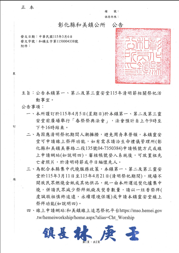 【協助公告】彰化縣和美鎮公所第一、第二及第三靈安堂115年清明節相關祭祀活動公告
