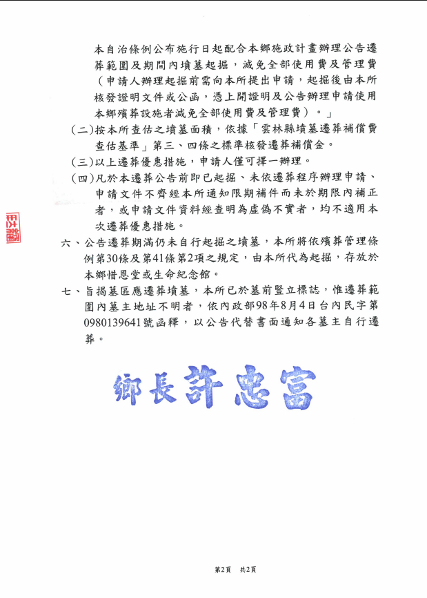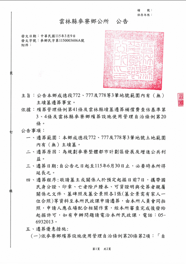 【協助公告】雲林縣麥寮鄉公所成德段772、777及778等3筆地號範圍內有(無)主墳墓遷葬公告