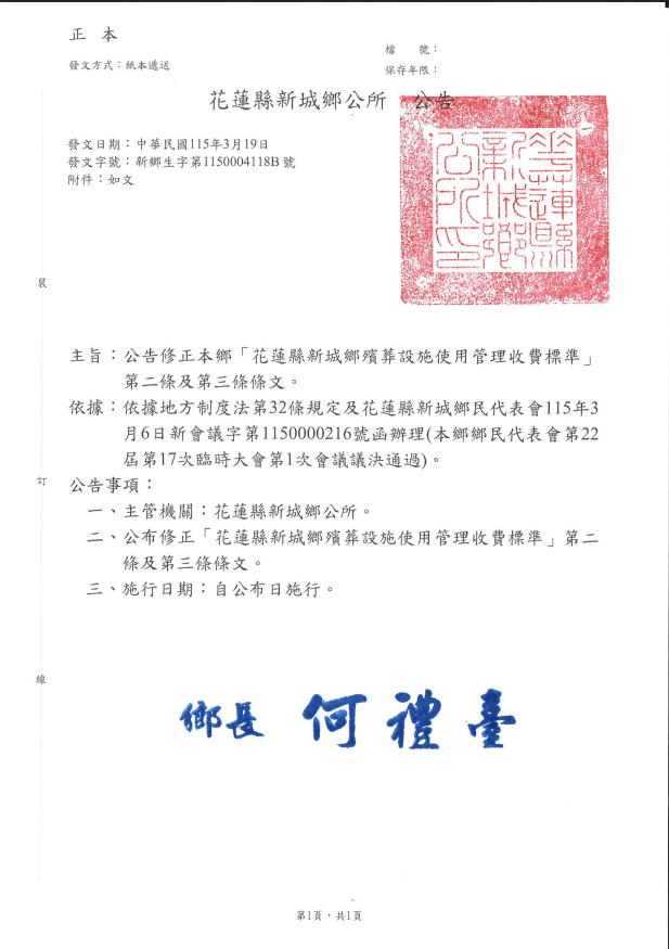 【協助公告】花蓮縣新城鄉公所「花蓮縣新城鄉殯葬設施使用管理收費標準」第二條及第三條修正公告