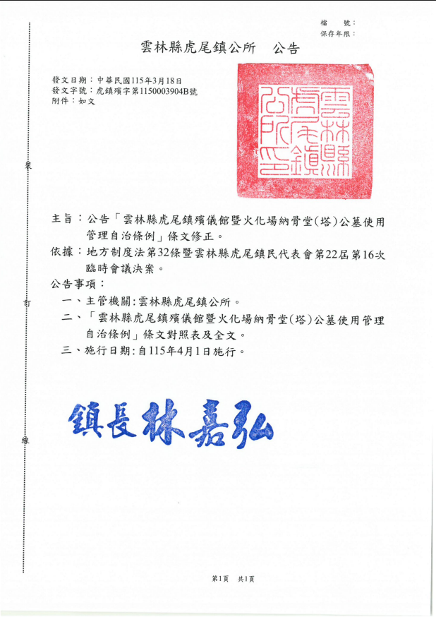 【協助公告】雲林縣虎尾鎮公所「雲林縣虎尾鎮殯儀館暨火化場納骨堂(塔)公墓使用管理自治條例」修訂部分條文之公告