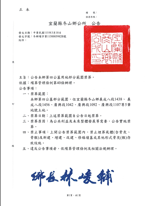 【協助公告】宜蘭縣冬山鄉公所第四公墓用地部分範圍禁葬公告